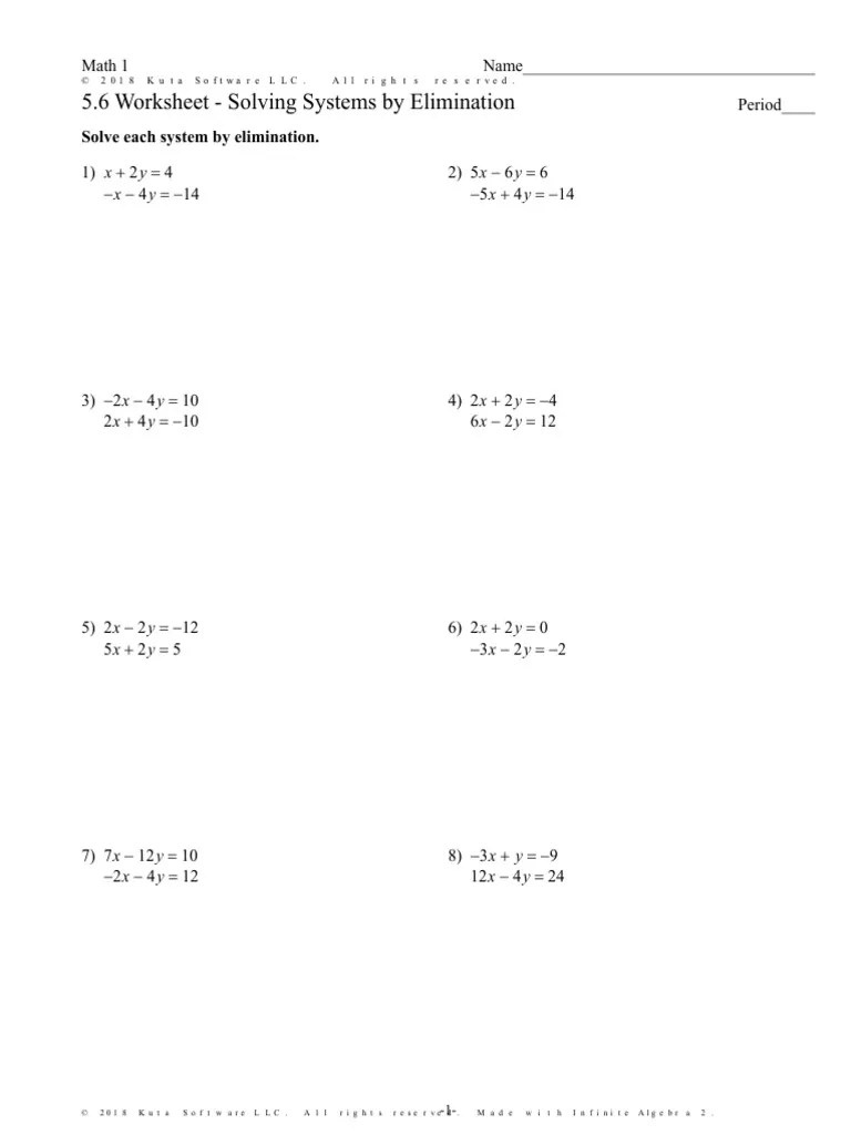 Solve each system by elimination. You will notice that the idea behind this method is to multiply one (or both) equations by a . Answers to solving 3 x 3 linear system by gaussian elimination. The solution of the pair of simultaneous equations. 1) x + 2 y = 4. Free systems of equations worksheets to help you with elimination, substitution, graphing, and word problems. Solve each system of equations by using the elimination method. Students are first required to solve 10 system problems using the elimination method. Each correct answer provides a . Solve each system by elimination. Check the solution in both of the original equations. Solve the following linear systems of equations by gaussian elimination: Students use properties of rational numbers to find a solution to a system, if it exists, through computation using substitution and elimination methods.